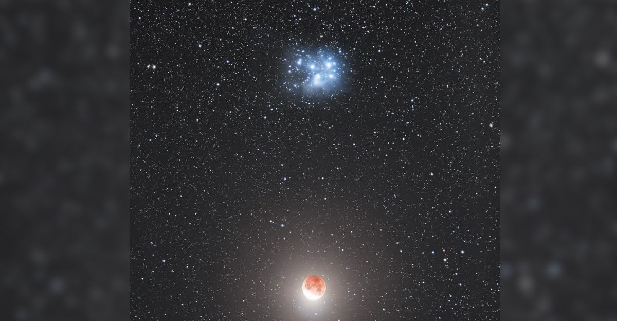 The bright lunar glow, brushing against the delicate cluster of blue stars, creates a mix of ancient beauty and modern wonder.