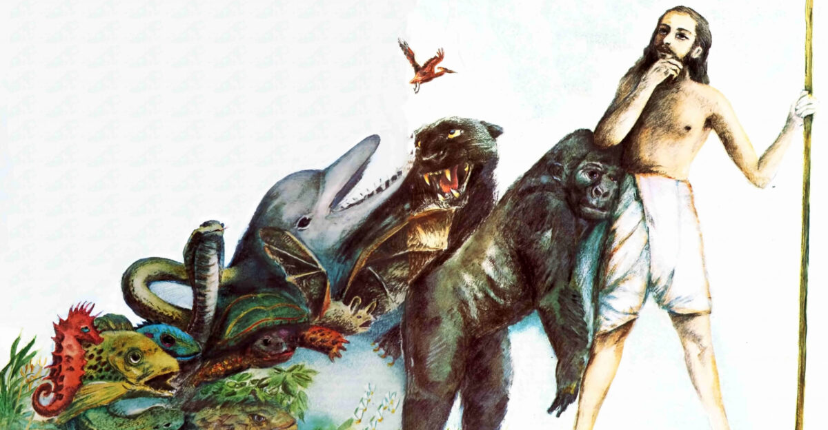 Stone carvings representing the theory of evolution displayed in an outdoor setting