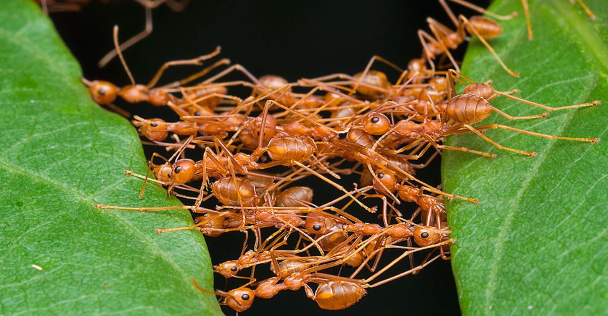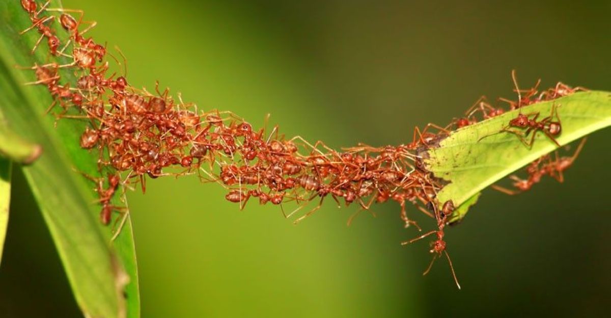 When faced with a wide gap, a colony of weaver ants doesn’t stop; it links bodies to create a living bridge. Each ant grasps another’s legs or mandibles, forming chains that stretch and flex as needed.