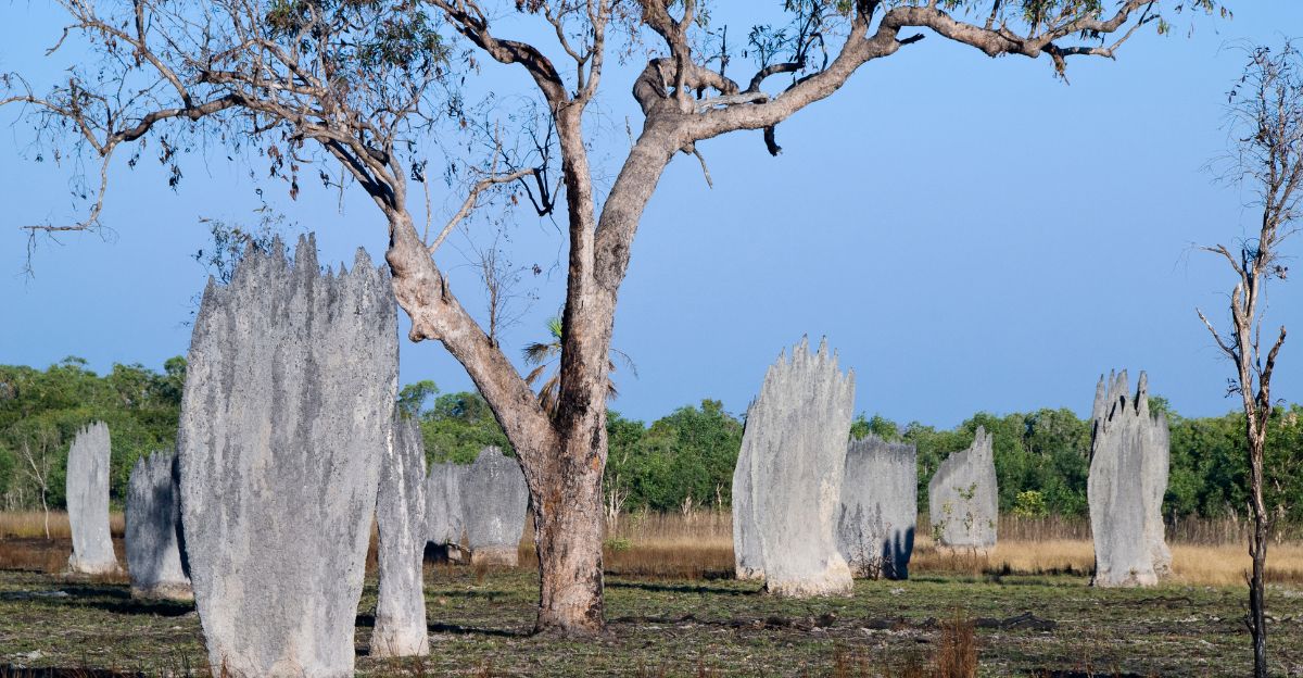 In northern Australia, millions of magnetic or “compass” termites build mounds aligned perfectly along the north–south axis. Each flat side catches morning and evening sunlight, while the narrow edge faces the midday sun to prevent overheating.