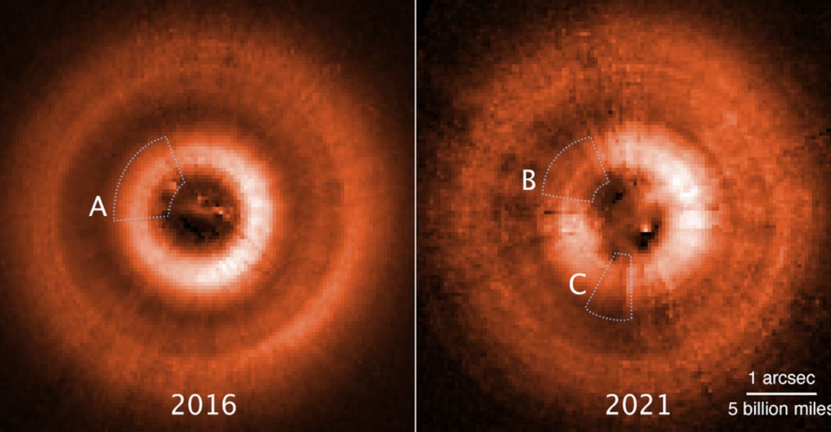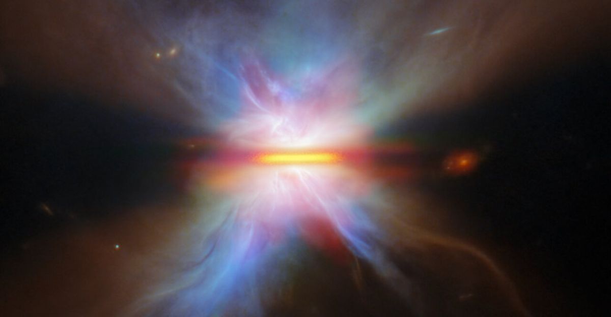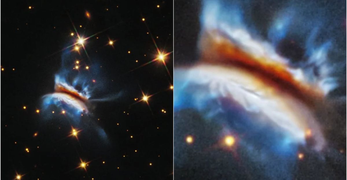 Hubble images show bright, uneven wisps of material stretching above and below the disk’s midplane. Lead researcher Kristina Monsch of the Space Telescope Science Institute described the structure as “much more active and chaotic than we expected,” according to NASA’s official announcement. Extended filaments appear prominently on one side, while the opposite edge looks sharply cut off.