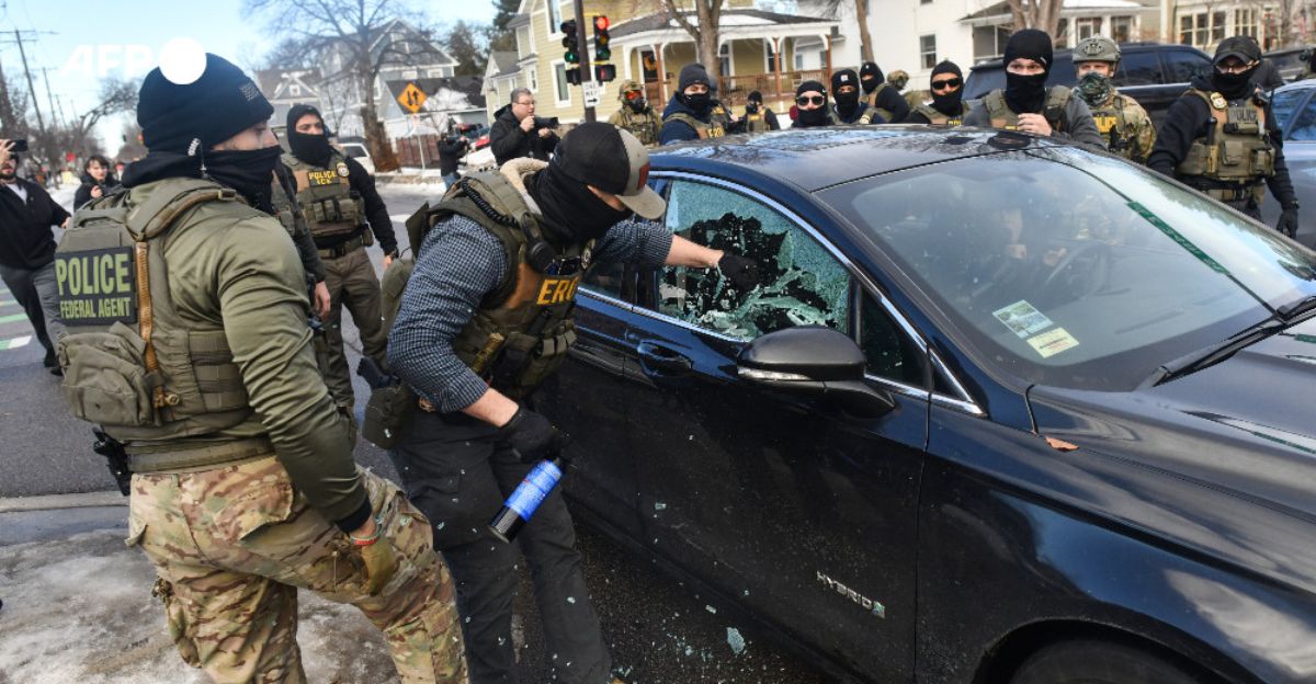 Four days after Good’s killing, another confrontation in South Minneapolis added fuel to the fire. ICE agents moved on a car they said had been following their vehicles despite repeated warnings to back off. Video and photographs from the scene show federal officers smashing the front windows with weapons or batons before pulling two anti‑ICE activists from the vehicle.