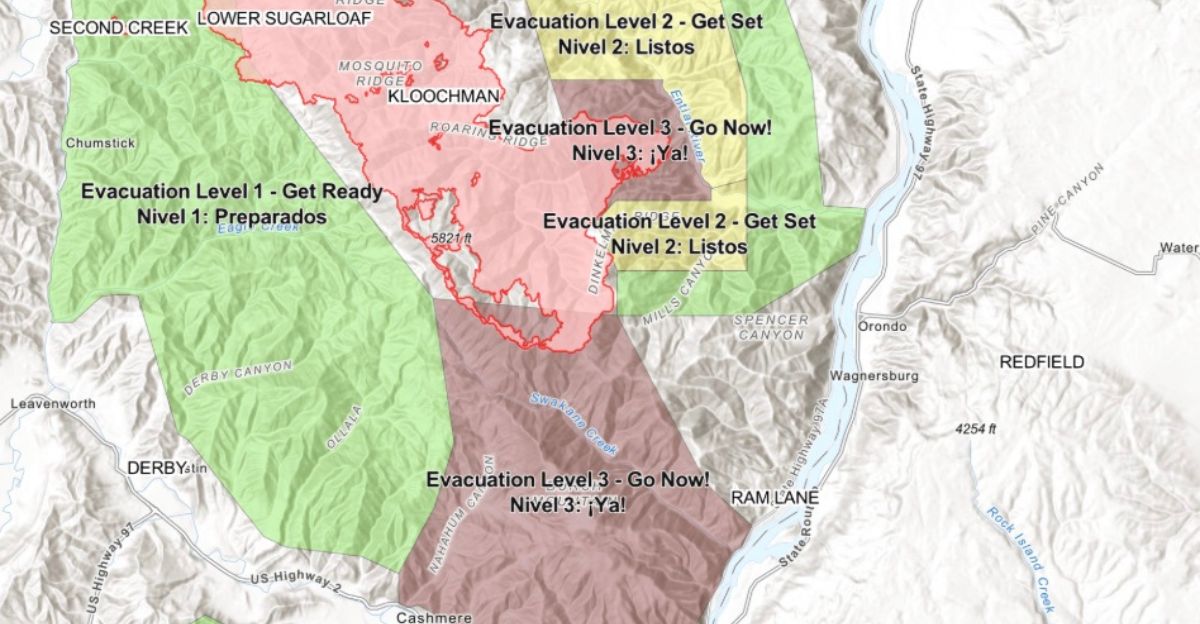 Las advertencias se volvieron más severas para quienes viven a lo largo de Mission Creek Road, Valley Hi y tramos de la US-97. La Gestión de Emergencias del Condado de Chelan actualizó sus mapas para ampliar las evacuaciones obligatorias, destacando que las rutas de escape podrían desaparecer al instante.